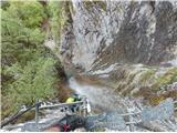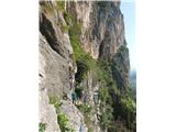 Svoje potovanje po Lobardiji in Trentinu sem zaključil na sloviti ferati Rino Pisetta - bom pisal kar pod to temo, čeprav je od Gardskega jezera oddaljena cca 25 km. Dostop je od krožišča v Sarche-ju, mimo dvorane športov (za dvorano se začnejo table). Zaradi ograjevanja parcel je začetek bolj čuden, a k sreči tabel ne manjka. Do vstopa je cca 200 višinskih metrov. Zavedati se je treba, da so ferato Rino Pisetta postavili leta 1982. Čeprav je bila vmes večkrat prenovljena (stari klini so večinoma odrezani), pa je ključni problem zlizana skala. Tudi obutev z odlično gumo večinoma ne pomaga. Zato se je večkrat treba opreti z nogama direktno na plato in vso težo na roke. Posledično je občutek težavnosti večji! Najtežja je vstopna stena, takoj prvi metri D in kmalu zatem še E del. Tudi v drugem delu je ferata precej navita (ponekod do D, občutek D/E). Vmes so seveda tudi lažji prehodi (A/B). Najlepši je zračni zgornji del. Kot rečeno je zaradi zlizane skale včasih prav problem poiskati del skale, kjer čevelj prime, kot je treba. Za nameček poteka ferata velikokrat ob širokih počeh, v katero pa se zlahka ujame noga (raje ne ugibam, kaj se takrat zgodi). Najslavnejši del proti vrhu ne preseže D. Od tam naprej so stvari enostavnejše (nikjer več kot C). Od klopce na vrhu se pot spusti mimo vasi Ranzo, kjer zavijete levo in takoj za majhno kapelico še enkrat levo. Sledimo najprej kolovozu, potem stari makadamski cesti in nato poti vedno v smeri nazaj proti Sarcheju (označeno). Na koncu sledi spust čez kratko steno z vklesanimi stopnicami ter za njo po gozdu do izhodišča.